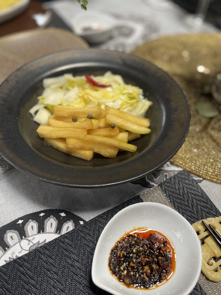 このレバニラ炒めに合うように、ひりっと香り高く黒ごまたっぷりで自家製の辣油を作りました。 白菜の甘酢漬けと大根の醬油漬けは定番の箸休め。
